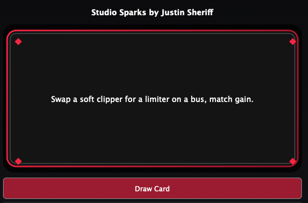 StudioSparks is a creative “idea deck” for producers, mixers, mastering engineers, and musicians. Click Draw Card (or press Space/Enter) to surface one of 200 curated prompts designed to unblock creativity, improve perspective, or nudge decisions without prescribing bad or unsafe engineering moves. It passes audio through transparently; no processing is applied.